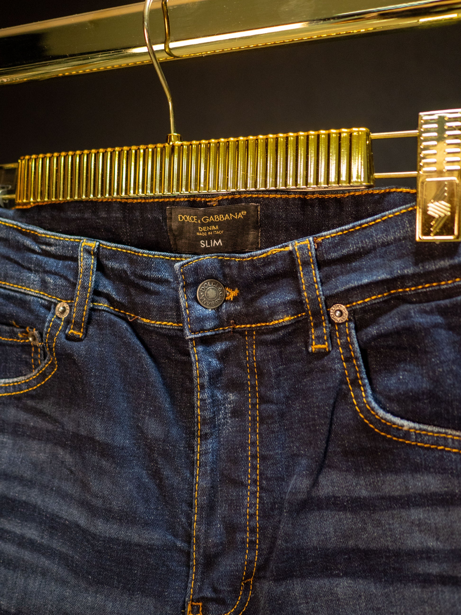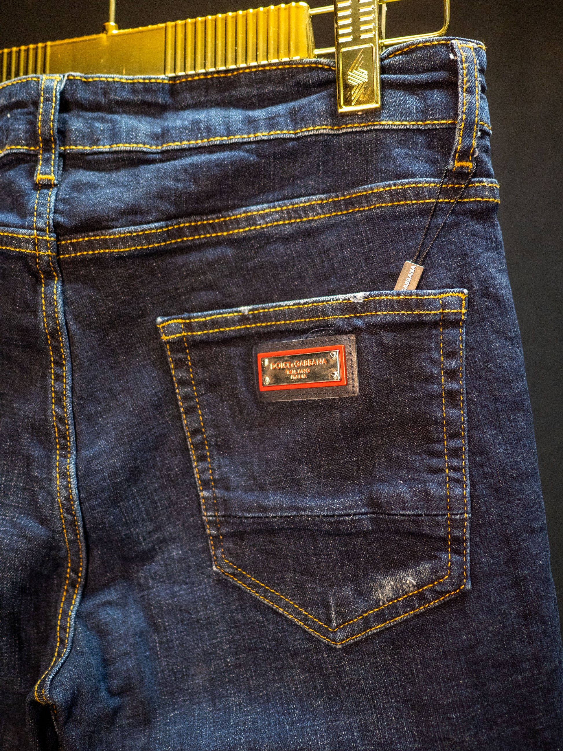 Този модел съчетава класическо петджобно оформление с леко избелени участъци и фино контрастни шевове за автентичен винтидж ефект. На задния джоб се откроява емблематична метална плочка с логото DG, стилно вградена в кожена апликация – акцент, който излъчва неподражаем лукс.